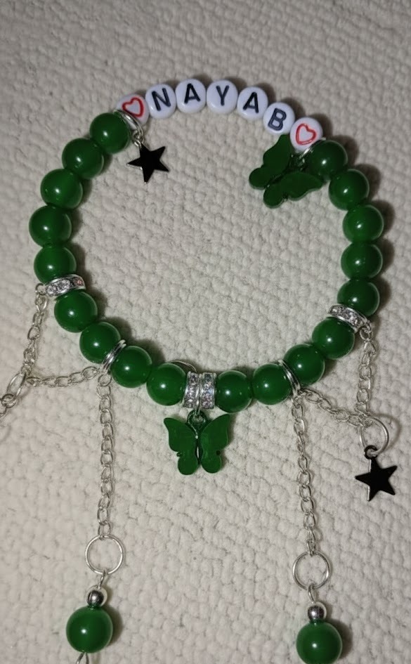 - Elegant Customised Name Bracelet handcrafted with vibrant green beads and shiny silver spacers, featuring personalized letter beads framed by hearts, accented with a detailed green butterfly charm, contrasting black star charms, and multiple delicate silver chain dangles for a trendy, customized accessory.