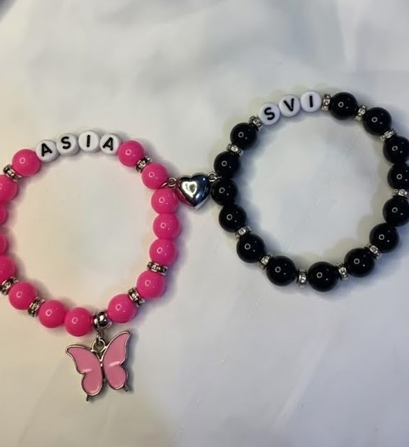 • Unique Aleeva Customised Name Couple Pair featuring one black beaded bracelet and one hot pink beaded bracelet, both personalized with names/initials and silver accents, connected by a metallic heart clasp and adorned with a pink butterfly charm.